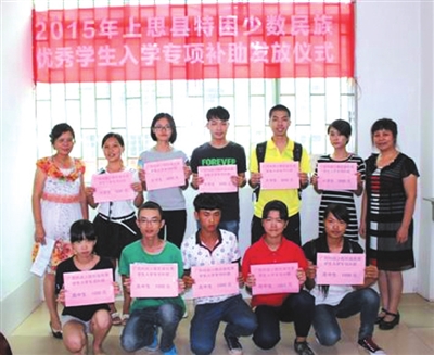 近日,上思县民宗局举行“2015年特困少数民族优秀学生入学专项补助发放仪式”,民宗局局长黄红梅在仪式上讲话并勉励受助学生珍惜来之不易的读书机会,时刻心怀感恩。同时,将2万元补助经费发放到10名特困少数民族优秀学生手中。