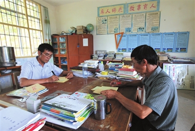 柳城县太平镇西岸村是自治区级贫困村,当地自然条件较差,学龄儿童随父母外出人数不断增多。目前,该村教学点一栋两层的教学楼里,只剩下一年级和二年级两个班的15名学生。林远芝和梁谋望两名老师就是这个教学点的“孩子王”。他们承担着孩子们的语文、数学、美术、品德等科目的教学任务,并照顾着孩子的日常生活。林远芝和梁谋望都是农民出身,20世纪七八十年代,他们原是村里的民办教师,每月工资只有10多元至30多元。农村家庭的经济负担较重,他们曾考虑离职“下海”闯荡,但最终还是坚持留在农村当编外的“教书匠”,直到转为公办教师。30多年时间里,他们在山村里默默地奉献着自己的青春和汗水。如今,他们的平均年龄超过50岁,梁谋望的教龄有32年,而林远芝的任教时间已有39年。一分耕耘,一分收获,他们曾先后获得柳城县、柳州市“先进教师”等荣誉。