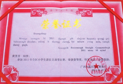 近几年来,学校参加自治区教育厅举办的全区讲壮文故事比赛,黄芳芳、黄仕伦两位同学均获得一等奖,黄月梅教师也获得指导老师二等奖。