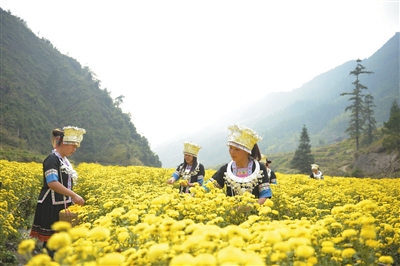 近年来,龙胜各族自治县加大种植业结构调整力度,利用当地良好的生态环境优势,大力发展可做茶饮品的有机皇菊产业,带动当地农户增收致富。近日,该县平等镇的皇菊进入盛花期,当地的侗族群众抓住晴好天气采摘、晾晒皇菊,田间一派繁忙景象。图为10月26日,在平等镇南山脚下,小江村的侗族群众正在皇菊基地采摘皇菊。