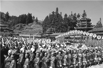 “瓜年”是水族辞旧迎新、庆贺丰收、走亲访友、祭祀祖先的盛大节日,也是水族的新年。关于达地乡水族过瓜年的来历,有说南瓜象征着田地,在丰收时,为了感恩田土,要用南瓜祭祀。图为当地群众欢度节日的场景。