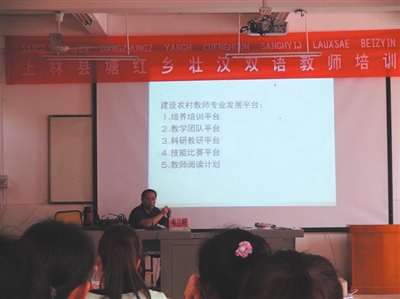 上林县塘红乡中心学校是一所农村学校,壮语在本地广为使用,由于学校的地理环境、位置等原因,语言文化基础浓厚。学校根据自身的特点,遵循“以壮为主,壮汉结合,以壮促汉,壮汉兼通”的双语教学方针,大力抓好壮汉双语教学,继承民族优良传统,弘扬民族灿烂文化。