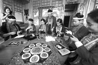 近几年,三江侗族自治县以精准扶贫为契机,着力加大对侗族刺绣、侗族农民画等非遗技艺的传承力度,加快侗族文化产业化发展进程,使“侗绣”“侗画”等非遗精品远销欧美市场,让众多侗族“绣娘”“画郎”足不出户便能轻松增收。图为同乐乡侗族“绣娘”在三江侗绣博物馆内刺绣。(龚普康 杨春茂 摄)