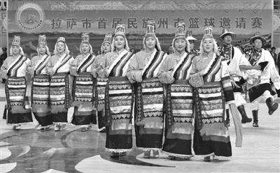 11月1日,拉萨市首届民族州市篮球邀请赛开赛。来自新疆、内蒙古、云南、吉林等地十个民族州市的篮球代表队、160余名篮球健儿参与角逐。图为演员们在比赛开始前表演舞蹈。