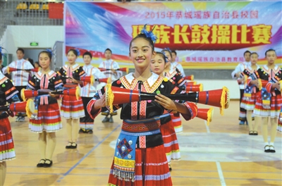 图为11月14日,该县教育局举办的第二届全县中小学生校园瑶族长鼓操比赛活动现场。