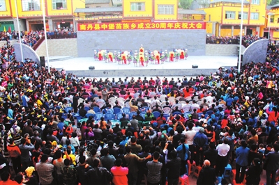 11月23日,南丹县中堡苗族乡处处欢声笑语、歌舞飞扬。1000多名当地及周边乡镇的干部群众欢聚在一起,用独特的民族歌舞庆祝苗乡成立30周年。