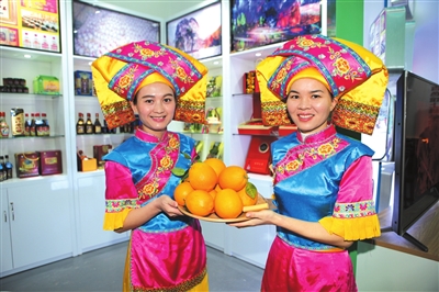 图为德保县壮族姑娘在开馆仪式上展示该县优质脐橙。