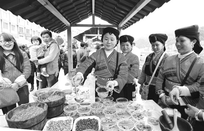 12月7日,“风味龙胜”首届民族特色小吃美食文化节在龙胜各族自治县特色街区举行。美食文化节汇集了当地苗、瑶、侗、壮、汉等民族的40多种民间特色小吃,全面展示龙胜世居民族特色美食和风俗文化,吸引了众多市民和游客前来参观、品尝。图为身着特色民族服装的红瑶妹为食客制作特色美食。