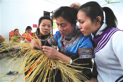 毛南族花竹帽编织技艺于2011年被列入国家级非物质文化遗产保护名录,为了做好传承保护工作,环江毛南族自治县面向全县男女青年不定期免费举办花竹帽编织工艺培训班,就花竹帽编织的用材及工具、竹篾选材及破竹篾技艺、花竹帽编织技艺等方面进行培训,掀起了传承非物质文化遗产的热潮。图为12月18日,环江毛南族自治县花竹帽编织技艺传承人谭素娟(中)指导毛南族青年学习编织花竹帽。