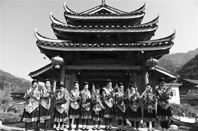 2015年12月27日,地处深山的三江侗族自治县老堡乡白文村古这屯举办“月也”活动。来自融水、三江两自治县10个村屯的侗、苗、瑶、壮族同胞欢聚一堂,以歌舞表演、多耶团圆、百家宴等多彩节目尽展风情,喜迎新年。侗族“月也”是侗寨间集体游乡做客的传统社交习俗,是少数民族地区增进民族团结进步的“强力胶”和“催化剂”。图为瑶妹吹芦笙。(龚普康 摄)