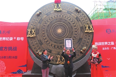 1月16日,吉尼斯世界纪录评审活动在桂林市阳朔县举行。由广西非物质文化遗产“壮族铜鼓铸造技艺”代表性传承人韦启初、韦启参兄弟领衔设计制作的一面直径4.2米、高2.6米、重达7吨的巨大铜鼓,获吉尼斯世界纪录,为目前世界最大铜鼓。