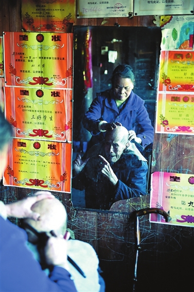 空闲的时候,赵桂兰就帮家公梁孝义剃头。堂屋的镜子旧得起了锈,周围贴满了孩子们的奖状。剃好头,用热毛巾擦擦,家公看着镜子中的自己,露出了开心的笑容。赵桂兰说:“媳妇也是女哦,女婿也是仔哦。”