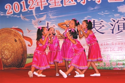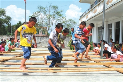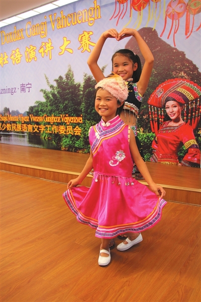 要求教师每周利用两个下午的时间进行壮语校本培训,使每位教师都会说标准壮语,都能胜任壮汉双语同步教学;对学生的要求则坚持在每天下午第一节课用10分钟时间进行壮语口语交际,提高学生的壮语口语表达能力;坚持开展丰富多彩的比赛活动。如开展壮语讲故事比赛,壮语文书法、习作比赛,提高学生壮语知识水平。学校坚持每月给中心校的《教育信息简报》和《太阳花》投稿,本学期该校有8篇学生壮文习作发表在《广西民族报》(壮文版)。学生看到自己的作品刊登在报纸上,得到很大的鼓舞,对壮文写作更感兴趣,更加积极。其他同学看到身边的同学能在《广西民族报》上发表文章,都跃跃欲试,写作欲望非常强烈。该校还开展形式多样的民族体育竞技活动,如:跳竹竿舞、广场民族舞、踩高跷、滑板鞋等活动,让学生在运动中体会到传承民族传统文化的重要意义。