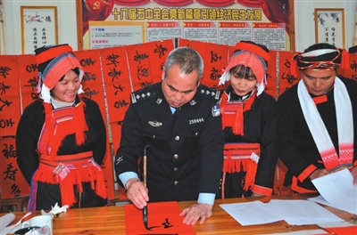 2月1日,金秀瑶族自治县长垌乡平道村古占屯和平孟村青山屯瑶族同胞身着盛装,喜气洋洋,精心挑选着该县公安局书法爱好者书写的各式福字和对联。据悉,当天,该县公安局为瑶族同胞书写赠送春联160余副。(张 莉 周 辉)