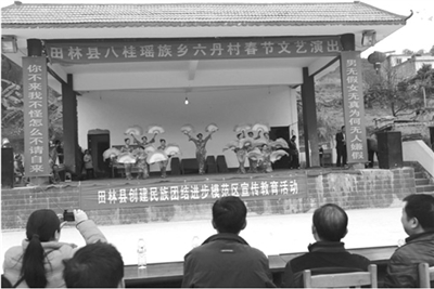 每年的正月初二至廿五,田林县各乡镇村屯都有举办春节联欢活动的习俗。田林县民族局结合实际,在此期间深入民族乡镇村屯,积极组织舞狮子、演壮剧,唱山歌、说快板、跳民族舞等文化活动,并以此为契机,把党的路线、方针、政策和法律法规及党的民族理论、民族政策,宣传到千家万户,既传承了民族传统文化,又使群众在享受文化的同时受到爱国主义和民族团结教育,牢固树立良好的国家观、民族观、宗教观、历史观、文化观。