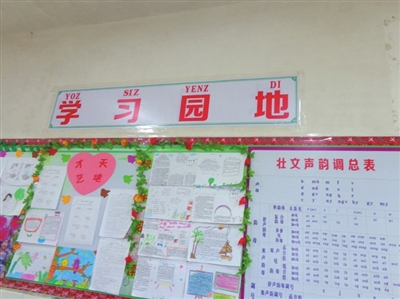 精心打造班级民族文化。凡在班级内悬挂、张贴的班风、班训、老师寄语和名人名言警句都写壮汉两种文字,班级的学习园地使用壮汉两种文字及具有壮民族特色的图案,营造壮汉双语教学氛围。