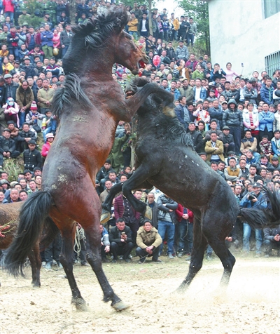 2月20日是猴年正月十三,融水苗族自治县安太苗乡举办斗马比赛,来自该县安太、香粉、红水等乡镇的40多匹烈马在赛场决一雌雄,吸引众多国内外游客到场观看。“斗马”已有500多年历史,是当地苗族同胞为裁决婚姻而设,现演变为一项娱乐活动。