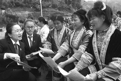 图为在该县安陲乡大塅苗寨,法官给苗族妇女讲解反家庭暴力法。