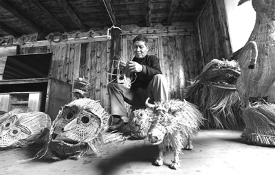 龙胜各族自治县平等镇广南村草龙草狮传习基地有一位70岁的自治区级“非遗”代表性传承人王禹。他凭借着精湛的手工技艺,以普通的糯禾秆草为主要材料,加上竹片、藤条、木条等辅助材料,采用编、织、插、嵌、镶、绕、缠、悬、挂、空、别、剔、镂、透等10多种工艺技巧娴熟地编制草龙、草狮、草牛、侗家鼓楼等工艺品,成为当地远近闻名的“草根艺人”。他的工艺品远销国内外,成为众多客商和艺术家的珍藏品。