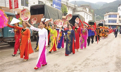3月10日,是中越边境宁明县爱店镇传统的农历“二月二”关帝庙会。爱店镇是全国文明镇,爱店口岸是国家陆路一类口岸,爱店关帝庙庙会融合了中越民俗风情文艺汇演、民间趣味竞技活动、祭拜大王庙和土地庙、庙会方块队游行、祭祀、和谐边关百家宴等丰富多彩的传统民俗文化活动,来自中越客商、边民群众等数千人纷至沓来,共同参与这一边关庙会盛事活动。 (通讯员 周贻刚 卢毅权 摄影报道)