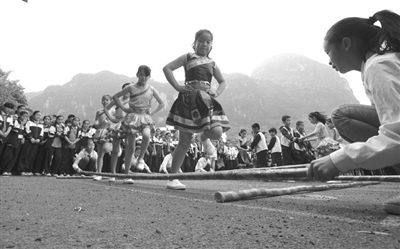 图为学生们在进行竹竿舞表演。