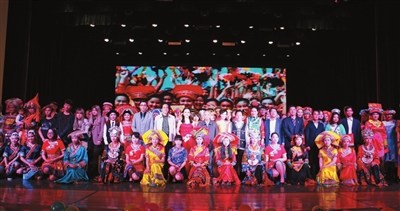 出席联欢会的领导为在本届“三月三”运动会中获奖的篮球队、排球队颁奖。谭勇、黄凤显及新媒体国际协同创新促进中心主任李一凡教授、国家新媒体产业基地北京新媒体联合实验室张旭总监为“新媒体国际协同创新促进中心东盟基地”揭牌,该基地由北京广西文化艺术促进会、新媒体国际协同创新促进中心、京象文创联合机构三家单位共建共享,共同致力于为北京、广西及东盟国家之间架起一座新的交流桥梁,从“一带一路”的战略高度促进区域经济文化的交流与发展。著名画家、广西北部湾书画院院长陈中华教授还为本届“三月三”组委会赠送了自创画作《壮乡三月三》,表达了对在京广西人士的节日祝福。此外,由中央民族大学合唱团精心准备的《敬酒歌》拉开了本届“三月三”大型联欢会的序幕。