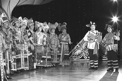 图为演员们在表演苗歌对唱《邀来阿哥晒月亮》。