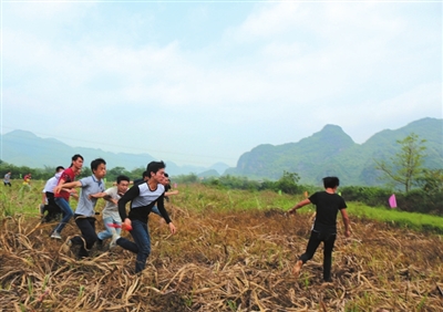 紧接着第二炮、第三炮燃响,全村男女老少齐上阵,在田间地头,追逐抢夺,村民脸上始终洋溢着笑容;观众亦是在旁欢呼鼓劲,现场热闹之极,欢乐的氛围让外地前来观看的游客亦为之感染。从南宁来的唐小姐告诉记者:“我以前在别的地方也看过抢花炮比赛,但都是在一些比较正规的比赛场地,在田间地头这种野趣十足的原生态比赛是头一次看到。”