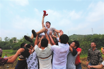 比赛结束后,抢得花炮的三位获奖者开心地捧着奖品,在众兄弟姐妹的簇拥下,一路敲锣打鼓、燃放鞭炮,享受着胜利后的喜悦,欢声笑语回家去。