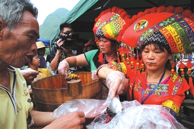 当天的开幕式还展示了即将在该乡开拍的《龙母传奇》动漫电影形象;举办了壮族山歌王邀请赛,各地山歌精英云集龙母圣地,敞开胸怀对唱壮山歌,决一雄雌。在龙母文化广场周边,长寿产品商贸展销活动也吸引了不少游客,最畅销的是当地产的黑豆和玉米,还有黑糯米和黑山羊肉。很多游客排队品尝龙母五色糯米饭,大家吃得津津有味,南宁游客黄先生一边品尝五色糯米饭一边说:“在龙母圣地吃五色糯米饭非常有意义,因为龙母慈孝的故事需要我们牢记心间,传承下去。”