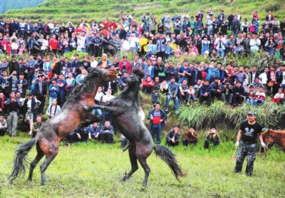 同日, 融水还在县城的民族体育公园斗马场举行了首场以市场运作、常年向游客展示苗族风俗的斗马活动。来自香粉、安太、四荣等乡镇的54匹雄马,通过咬、踢、撕、追等“绝招”进行激烈搏斗,吸引众多游客前来观看。 据悉,此后民族体育公园斗马场将定期于每个星期六中午12点开始举办斗马活动,游客可购票入场观看。