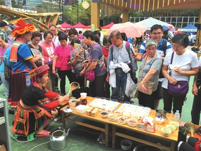 4月16日,香港“赏心乐食”美食文化节在香港维多利亚公园开幕。4月19日,壮乡歌舞、天琴弹唱、民族服饰走秀、绣球制作展示、《刘三姐》老电影……美食文化节迎来广西主题日,活动现场掀起了广西民族风。在广西展区,恭城油茶飘香迎客,供不应求。