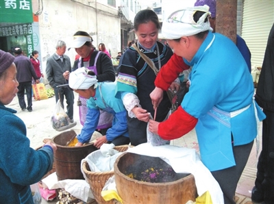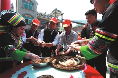 三月三西林有家家户户蒸五色糯米饭、制作糍粑、煮红鸡蛋等习俗,人们带着这些美食到活动现场与人共享。在县城美食街,琳琅满目的糍粑、五色糯米饭等特色美食,一字排开,让人们在大饱口福的同时,品味到“舌尖上壮乡”的独特韵味。