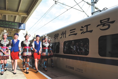 5月15日17时43分,“柳州三江号”缓缓驶出了始发站——三江南站,三江侗族自治县成为了全国首个动车始发终到站的少数民族自治县。“柳州三江号”是南宁铁路局首次在县级行政区开行始发动车组列车,也是全国首次在少数民族自治县、国定贫困县开行始发旅游扶贫动车。这对列车的开行,将进一步凸显三江交通枢纽、生态产业、风情旅游等发展优势,激活侗乡经济社会发展潜力,助力侗乡精准脱贫,扩大粤桂黔三省区高铁经济带的乘数效应。(通讯员 龚普康 摄)