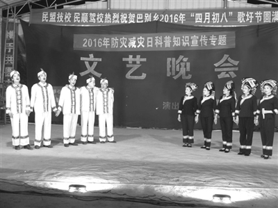 田阳县科学技术协会不断拓宽科普知识下乡进村渠道,全县科普知识宣传工作开展得有声有色。在今年全国科技活动周期间,该县科协组织文艺宣传队深入该县南部山区巴别乡,在“四月初八”传统歌圩节举办专题晚会,广泛宣传“防灾减灾”等科普知识。图为演员们在表演山歌对唱。