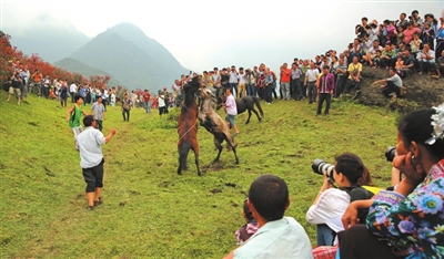 “赏花斗马”节当天,苗民们在元宝山主峰东面山麓,云天作幕帐,山峰为布景,草坪搭舞台,在杜鹃花丛中欢歌起舞。原汁原味、酣畅淋漓的苗族风情,让摄影家、作家以及采访团惊叹不已,视频录音齐上阵,长枪短炮摄不停。