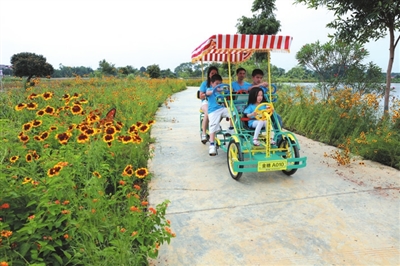 在定典屯金穗生态园,五彩斑斓的鲜花随处可见,众多市内外游客争相拍照,来自贵港市的黄女士一家5口踩着自行车畅游园区,十分惬意。“早就想来了,趁着节庆,又是周末,带孩子们来山间野外放松放松,挺好的。”她说道。