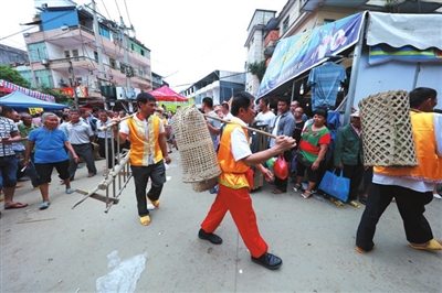 启动仪式结束后,巡游队伍沿着那桐镇主干道进行巡游,所到之处,百姓欢呼雀跃,自发跟着队伍巡游,祈求来年顺利兴旺。各种农具摆满那桐集市,有扁担、镰刀、柴刀等,也有经过改良的现代农具小铁牛、榨油机,还有一些古老器具和小商品。