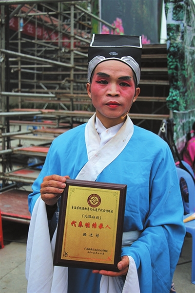 说起骆进祥,田林县旧州镇爱好壮剧的人无人不知无人不晓。他是平保村人,少年时就对壮剧特别喜爱,长期随村里的长辈学习壮剧,因聪明好学,乐器使用、丑角、小生、剧本编写、化妆、导演他样样精通。从艺25年来,他不但在壮剧演出、研究中作出贡献,还很好地将传统壮剧的精髓和时代结合,将“壮剧发源地”的壮剧艺术发扬光大。为此,2015年骆进祥获得了由自治区文化厅颁发的“自治区级非物质文化遗产项目北路壮剧代表性传承人”称号。