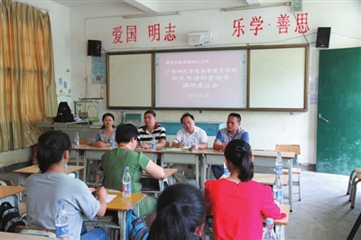 随后,调研组一行与地苏镇中心小学副校长、南江小学老师以及该院实习生进行座谈,听取了他们对壮汉双语师资培养的意见和建议。邹循东说,该小学的实习生多为当地子弟,这种就地培养人才的方式,更有利于为民族地区培养“下得去,留得住”的师资人才,更好地为民族地区服务,为民族教育事业做贡献。座谈会期间,地苏镇中心小学副校长、南江小学校长及实习生的指导老师,对实习生的知识和能力给予肯定,一致认为此举将大大增强民族地区教育师资队伍的力量,为民族教育注入新活力。