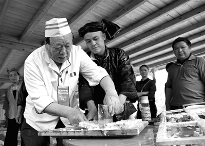 5月25日,柳州市“非遗”文化“芙蓉酥”传承人岑有培走进偏远的融安县长安镇安宁村大袍屯苗族村寨,传授“芙蓉酥”、扣肉等美食的制作方法,培训少数民族群众学习制作传统美食,让具有桂北特色的“芙蓉酥”走进贫困山区,推动贫困山区发展民族特色旅游,帮助贫困农户早日脱贫致富。图为岑有培在教苗族群众做“芙蓉酥”。