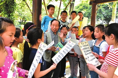 从工作了43年的文化战线上退休后,秦国明醉心于公益事业,拿出10万元修建了山歌艺术馆,并在馆里、家里、社区、学校和辖区单位开设课堂,义务培训各界山歌创作和山歌爱好者1万多人次,使一大批“山歌达人”脱颖而出。去年纪念抗战胜利70周年阅兵活动结束后的第二天,他通宵达旦赶写了100多首反映从抗战时期艰难困苦到改革开放后所取得的辉煌成就的山歌,配上他收集的80幅图片,制作成一个长达20米的“抗战胜利70周年80板”山歌宣传展板,并利用一个月时间,带着他的快板到20多个社区免费巡演,收到很好的教育效果。