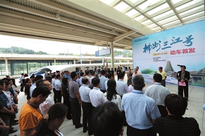 5月15日17时43分,“柳州三江号”缓缓驶出了始发站—— 三江南站。“柳州三江号”是南宁铁路局首次在县级行政区开行的始发动车组列车,也是全国首次在少数民族自治县、国家重点扶贫开发县始发旅游扶贫动车。“柳州三江号”的开行,将有利于发挥三江交通枢纽、生态产业、风 情旅游等优势,进一步挖掘侗乡经济社会的发展潜力,助推侗乡精准脱贫工作开展,进一步凸现粤、桂、黔三省区高铁经济带的良好效应。