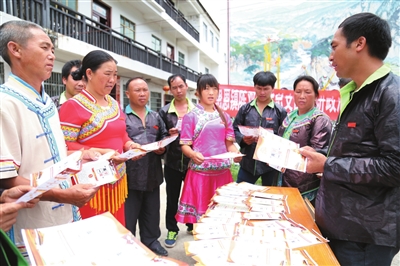 图为苗族党员干部韦玉荣(右一)通过壮语、苗语、毛南语、瑶语等少数民族语言想群众宣传“两学一做”知识。 (陈光科 摄)