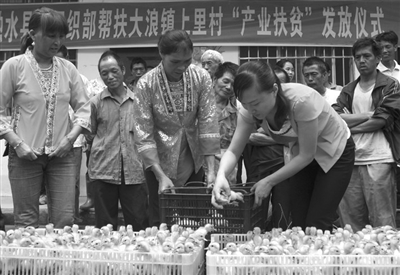 6月3日,融水苗族自治县党委组织部和大浪镇党委在上里村联合举行“产业扶贫”发放仪式。近10名党员干部将1200多羽香鸭苗和1.4余万尾禾花鲤鱼苗分别赠送给上里村61户贫困家庭,以此引导农民发展特色产业,促进农民增收致富。图为在上里村,一名党员在给贫困户发放鸭苗。