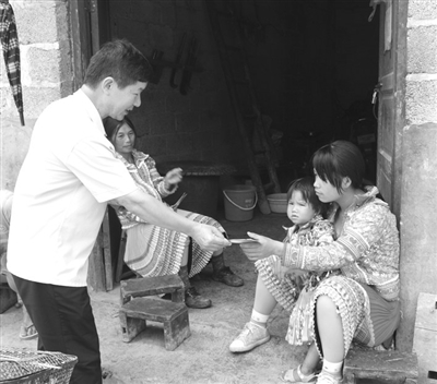 近日,那坡县人民法院百都人民法庭的法官深入地处中越边境线的百省乡面良村苗寨开展法制宣传教育活动,登门入户发放法律宣传资料,引导边民学法、知法、守法,以促进边境地区的社会稳定和民族团结。当天共发放宣传资料100多份。图为法官登门给苗胞发放宣传资料。