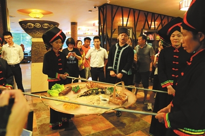 6月19日至20日,马来西亚的旅游同业考察团到大新县骆越田园汽车营地、明仕田园、德天跨国大瀑布等景区考察、体验民俗风情,此次考察的目的是开拓中国大陆旅游路线并与当地旅游管理部门交流经验,谋求共同发展。图为19日,在大新县堪圩乡明仕田园景区,考察团正在体验当地特色菜谱“壮王土司宴”。