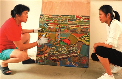 6月29日,10多名三江侗族自治县独峒乡的农民画师给农民画 “升级”,进行漆画改造,由著名的漆画艺术家梁铝(左)现场进行指导。首期对100幅农民画进行漆画升级改造,在保留三江侗族农民画传统艺术风格的基础上,把原来的锅墨、蓝靛、水彩等颜料,升级为由桐油、漆、碳粉、银粉、铜丝和蛋壳等材料,后期再进行抛光、装裱,使得农民画更易于保存。