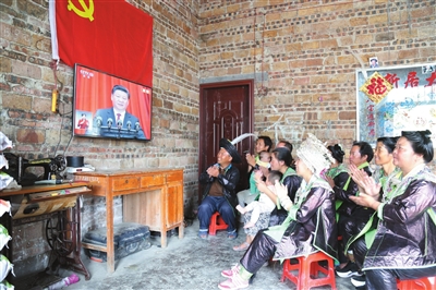 7月1日,环江毛南族自治县思恩镇陈双村双乐屯党支部20多名苗族党员干部组织移民群众收看庆祝中国共产党成立95周年大会实况直播。当天,庆祝中国共产党成立95周年大会在北京人民大会堂隆重举行,该县县、乡(镇)、村(社区)三级党组织组织党员干部及各族人民群众通过电视直播、党员干部远程教育终端设备“直播课堂”等观看大会实况,共同庆祝党的生日。(陈光科 摄)