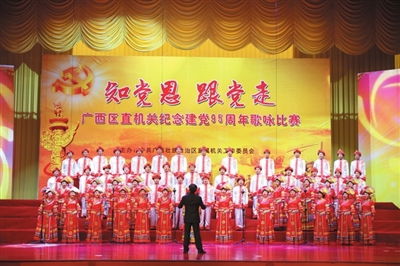 6月26日,由自治区直属机关工委主办的“知党恩 跟党走”区直机关纪念建党95周年歌咏比赛(初赛)在自治区政协礼堂隆重举行。自治区民语委由委机关和直属单位干部职工50余人组成的参赛队,在该委副主任翚永红、副巡视员余飞率领下参加比赛。
